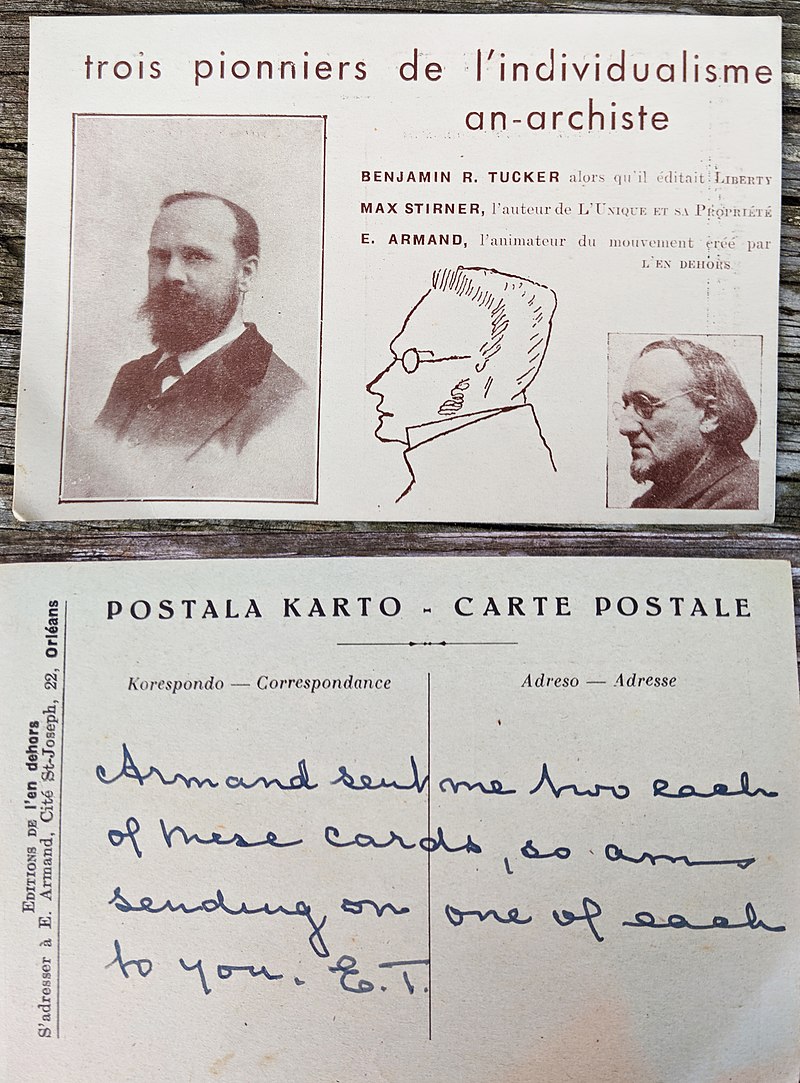 Editée par Emile Armand lui même, elle le montre en compagnie de Stirner, le vieux rival de Marx, que les Français découvraient en « décalé » et à peu près en même temps que Nietzche, et de Benjamin Tucker, le libertaire américain. Tucker est présenté comme l’éditeur du journal Liberty, et Stirner, évidemment comme l’auteur de « L’Unique et sa propriété ».