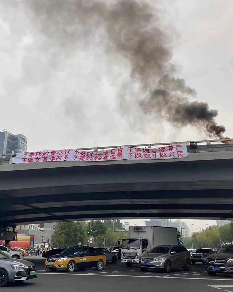 Les mots d’ordre des deux banderoles et des hauts parleurs étaient les suivants: « Nous voulons de la nourriture ! », « Nous voulons la Liberté », « Nous voulons des élections », « Mettez vous en grève », « Boycottez les cours », « Eliminez le dictateur et traître à la nation, Xi Jinping », « Dites Non aux tests Covid, Oui à la nourriture », « Dites Non au confinement, Oui à la liberté », « Non aux mensonges, Oui à la dignité », « Non à la révolution culturelle, Oui à la réforme », « Non au Grand Chef, Ne soyez pas esclaves, Soyez des citoyens ».