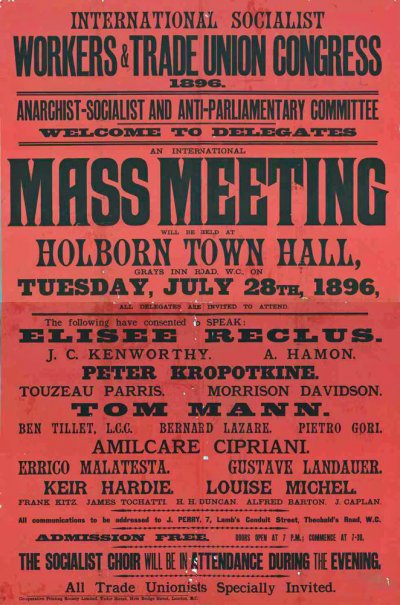 Le 28 juillet, deux grands meetings rassemblent ainsi plusieurs milliers d’auditeurs au Holborn Town Hall et au Working’s Men Club and Institute. Le comité anarchiste et antiparlementaire de Londres y donne la parole à Keir Hardie et à Tom Mann (ILP), à Cornélissen et à Nieuwenhuis (SDB), à Landauer (Indépendants), à William Morris (ex-leader de la SL), à Allemane (POSR) et aux anarchistes Élysée Reclus, Lazare, Louise Michel, Kropotkine, Tortelier, Pietro Gori et Errico Malatesta.
