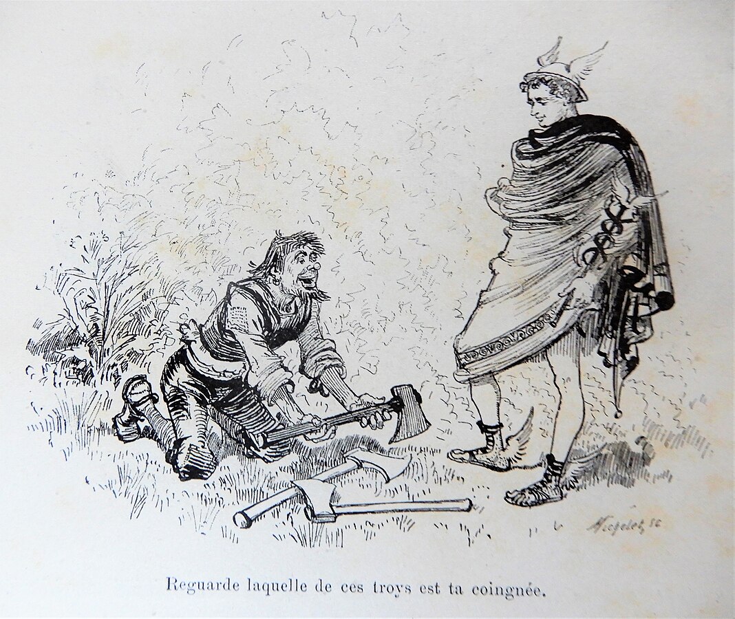 « Zà, çà ! (dist Juppiter à Mercure) descendez praesentement là-bas, et jectez es pieds de Couillatris troys coingnées : la sienne, une aultre d’or et une tierce d’argent massives, toutes d’un qualibre. Luy ayant baillé l’option de choisir, s’il prend la sienne et s’en contente, donnez-luy les deux aultres. S’il prend aultre que la sienne, couppez-luy la teste avecques la sienne propre. Et désormais ainsi faictes à ces perdeurs de coingnées. »